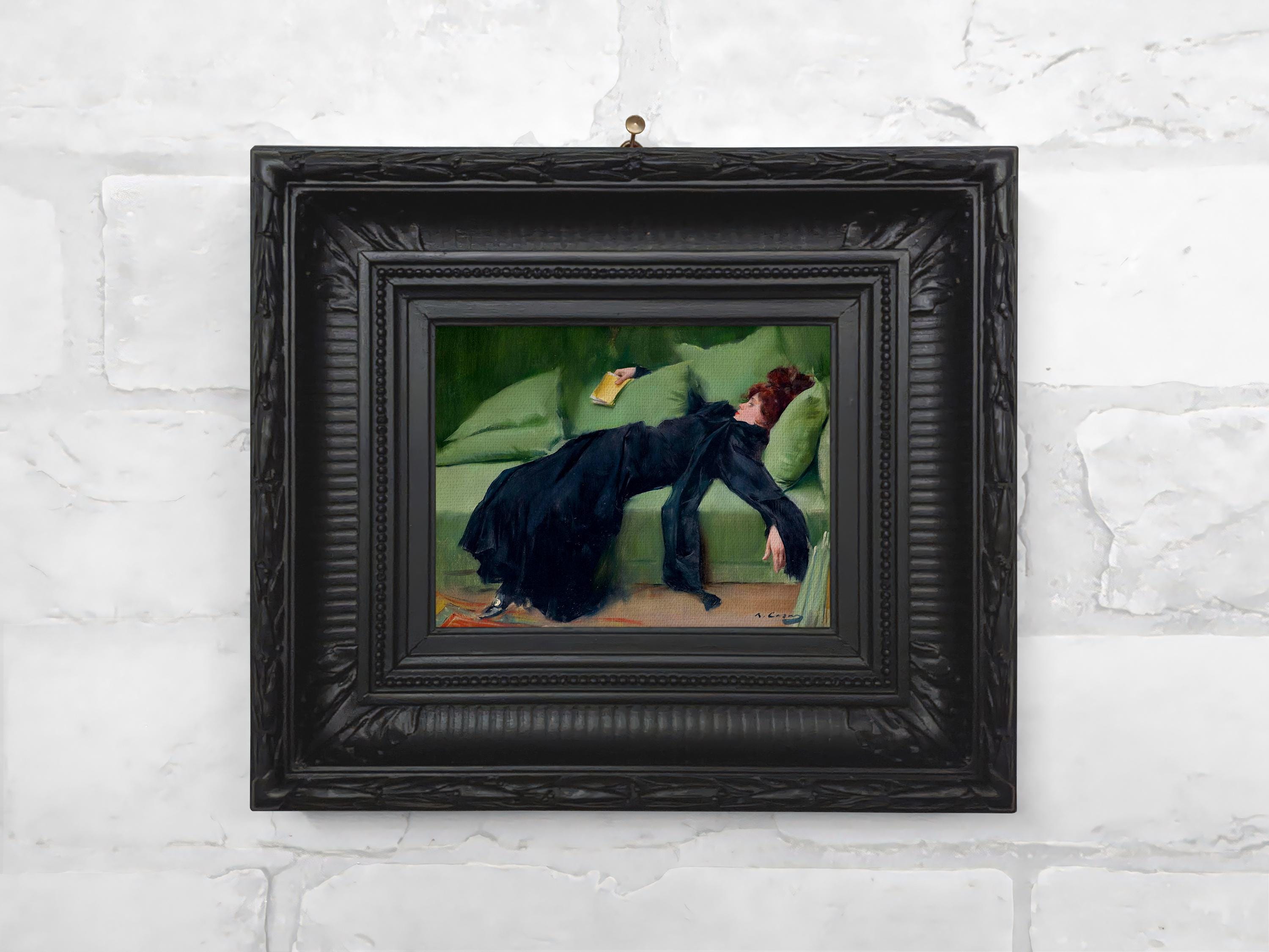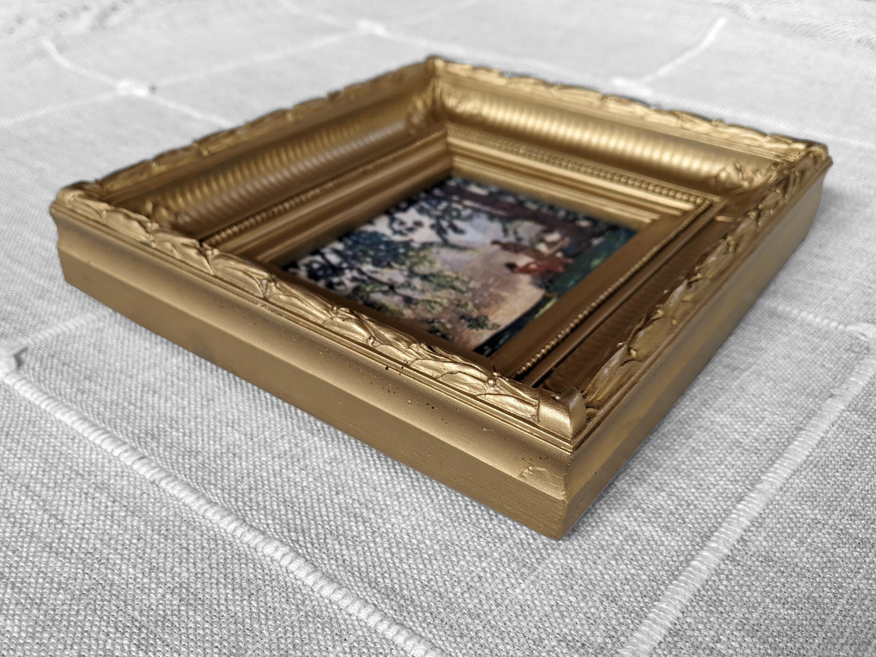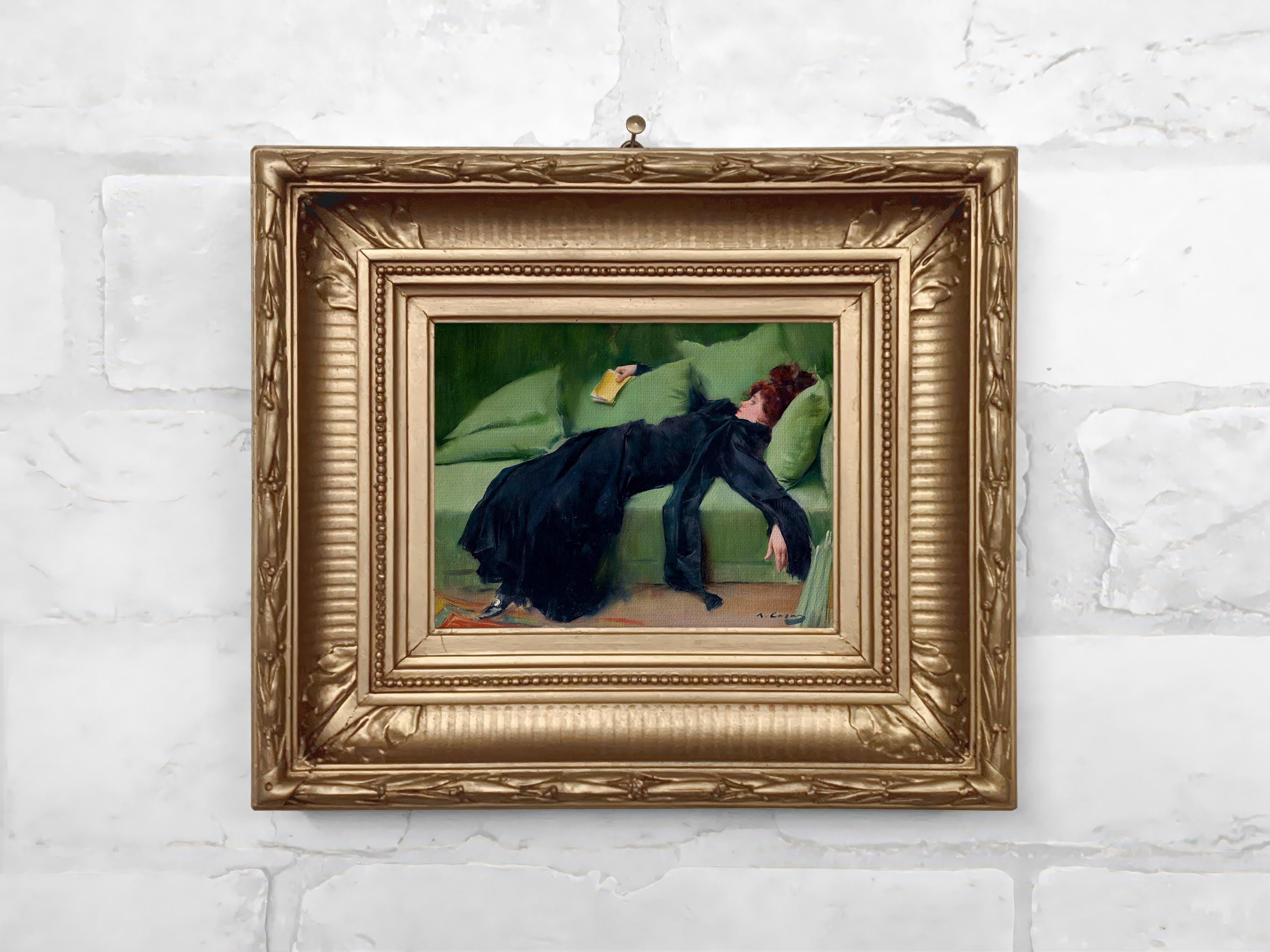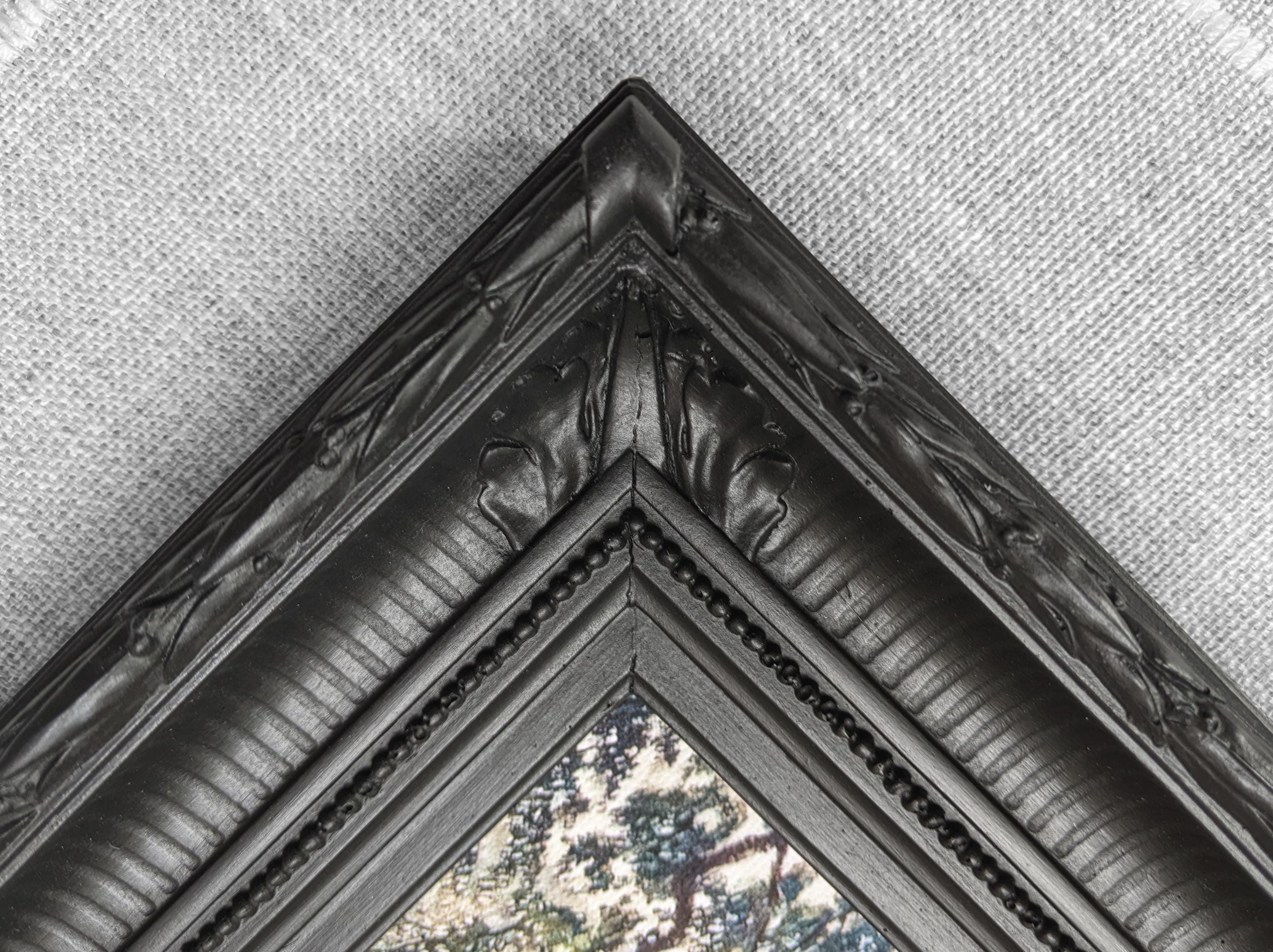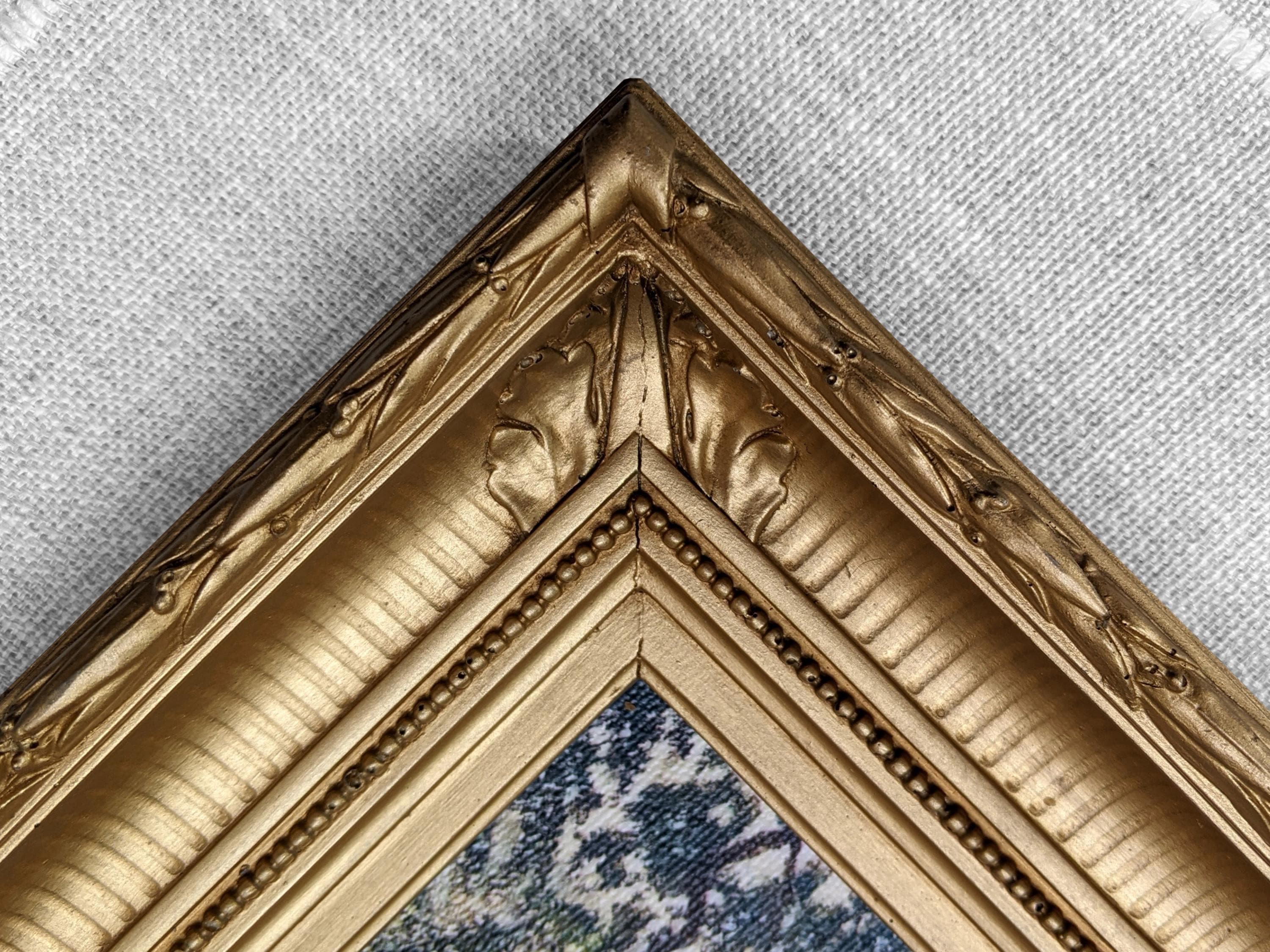 This small oil painting reproduction is printed on archival canvas and paired with a handcrafted frame cast in Hydrostone, using a mold from a 19th-century antique. Finished in-studio to capture the texture and patina of a real vintage frame, it offers all the beauty of an heirloom – without having to inherit it. Available in aged gold or classic black, depending on your mood (or your wall).