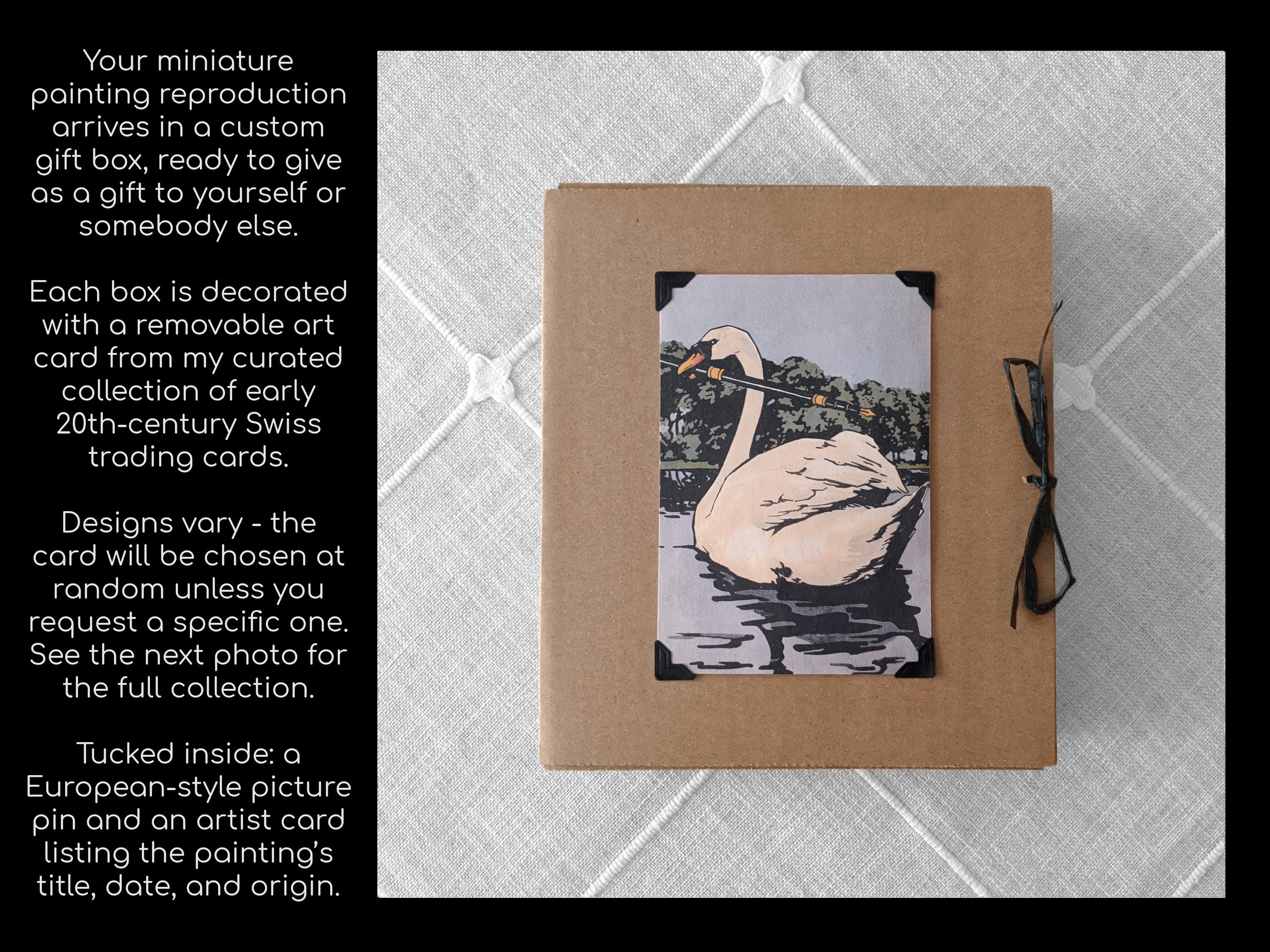 Sized in our Mini Cove format, this piece makes a quiet statement on a shelf, gallery wall, or anywhere that needs a little mood and a lot of attitude. It arrives in a custom gift box that includes a removable art card from my curated collection of early 20th-century Swiss lithographed trading cards. On the back: a short message tied to the image - something between a fortune and a pep talk from the ghosts of a Swiss art collective. They’re collectible, slightly mysterious, and full of charm. Designs vary and yours will be chosen at random unless you request a specific one. See the last photo for the full collection. Inside the box, you’ll find a picture pin and an artist card with all the painting’s details.