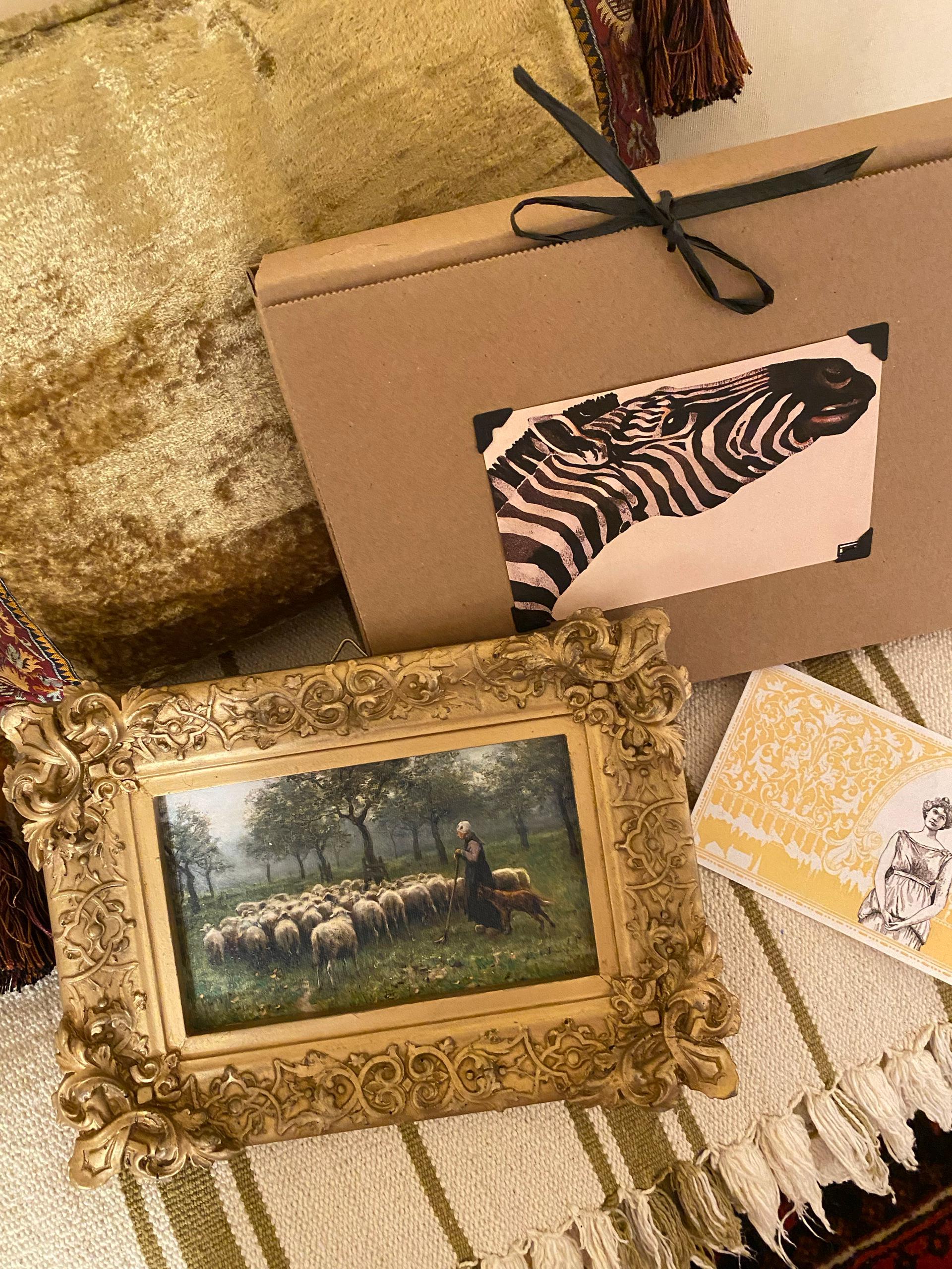 Sized in our Small format, this piece makes a quiet statement on a shelf, gallery wall, or anywhere that needs a little mood and a lot of character. It arrives in a custom gift box that includes a removable art card from my curated collection of early 20th-century Swiss lithographed trading cards. On the back: a short message tied to the image - something between a fortune and a pep talk from the ghosts of a Swiss art collective. They’re collectible, slightly mysterious, and full of charm. Designs vary and yours will be chosen at random unless you request a specific one. See the last photo for the full collection. Inside the box, you’ll find a picture pin and an artist card with all the painting’s details.