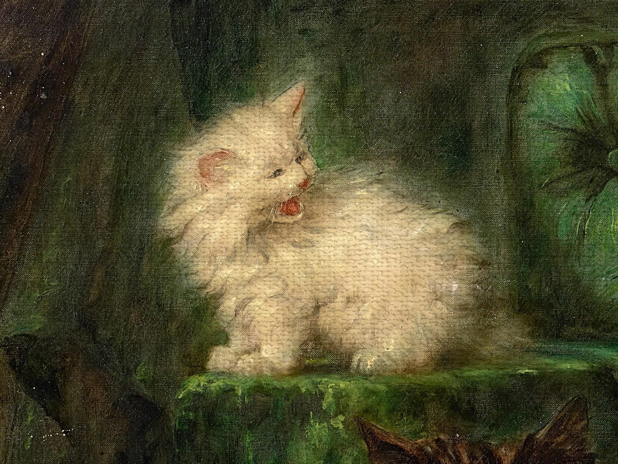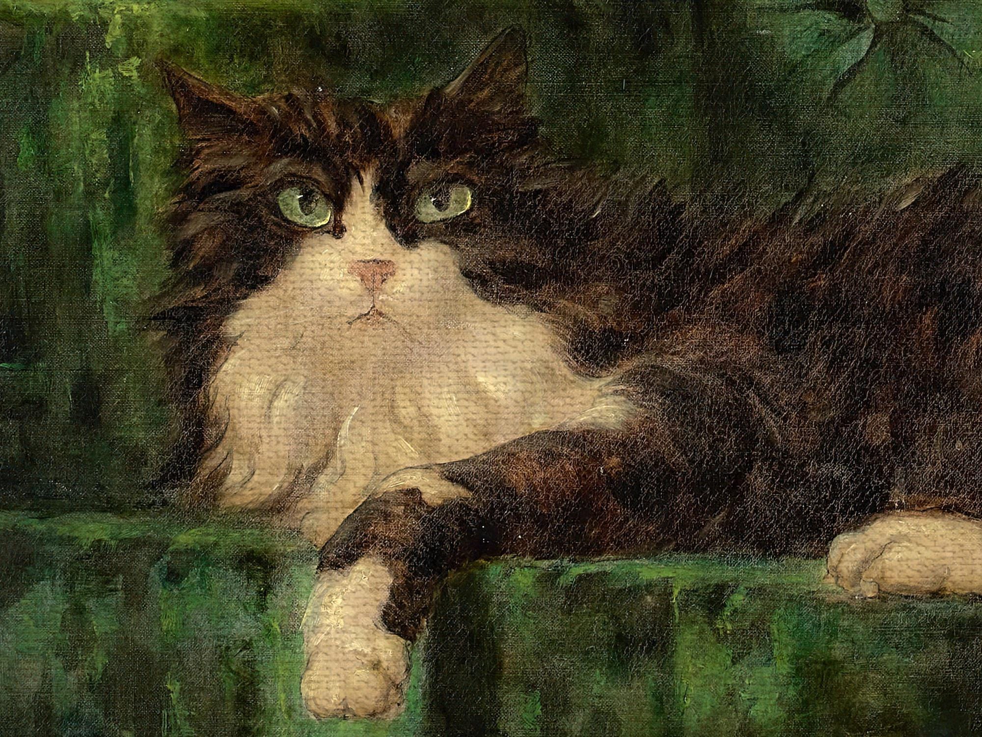 A Tuxedo Cat and a White Kitten on a Green Sofa by Carl Kahler (c.1890) captures the exact kind of domestic drama only cats can stage. The tuxedo sits composed and worldly, while the white kitten hisses from the arm of the sofa - small, furious, and thoroughly unimpressed. Kahler had a reputation for painting cats as if they were aristocrats, and here he gives us the full social hierarchy in fur and attitude.
