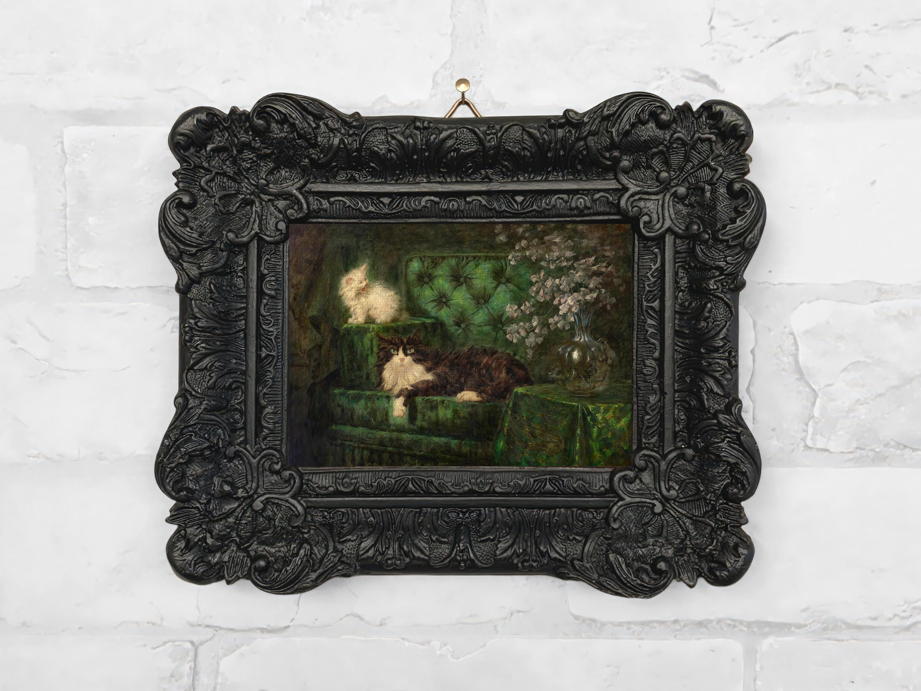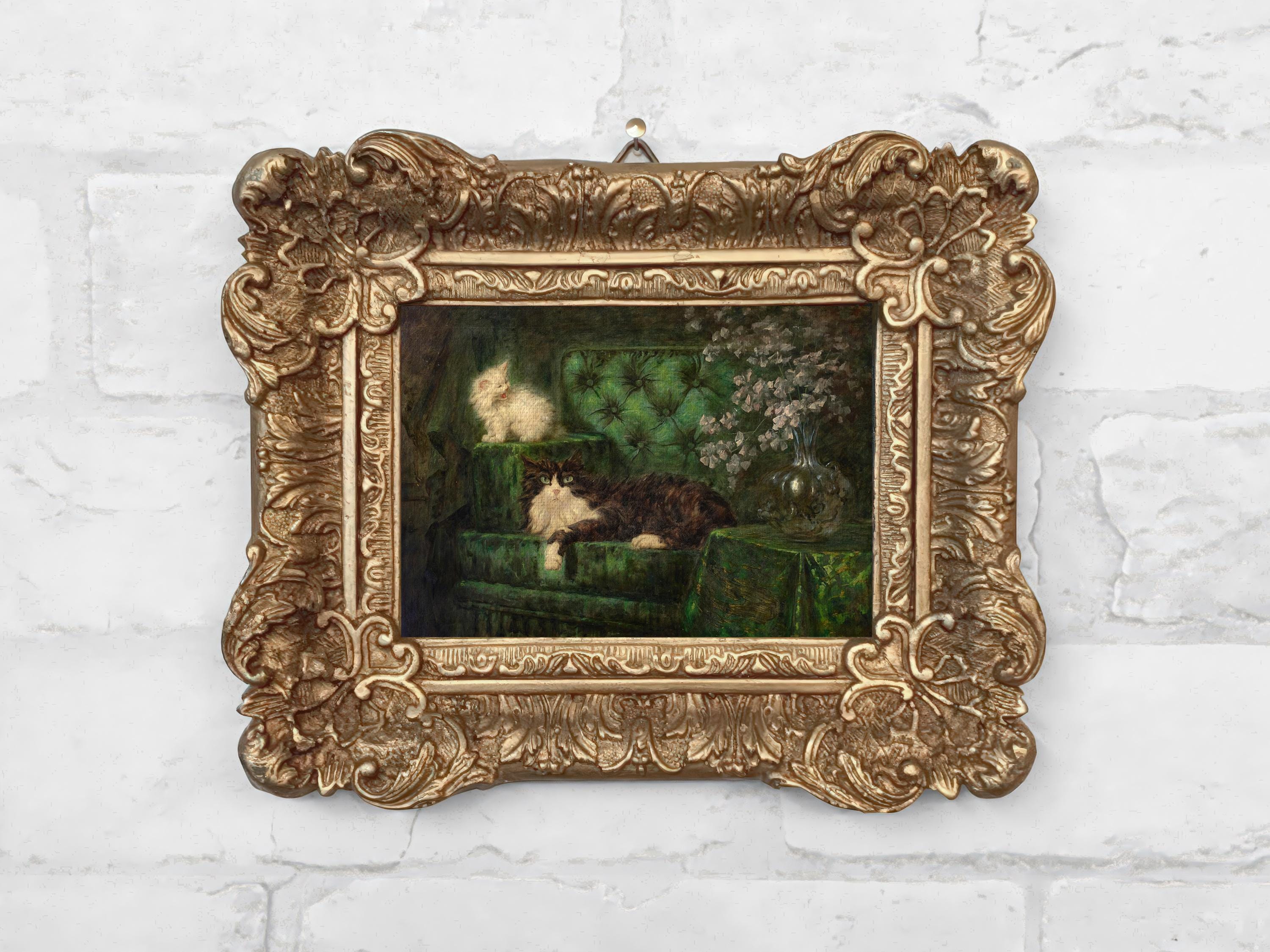 Miniature framed cat art print on canvas, vintage-style reproduction of an antique oil painting featuring a tuxedo cat and white kitten lounging on a green sofa. Perfect for Victorian interiors, eclectic gallery walls, and lovers of moody feline drama.