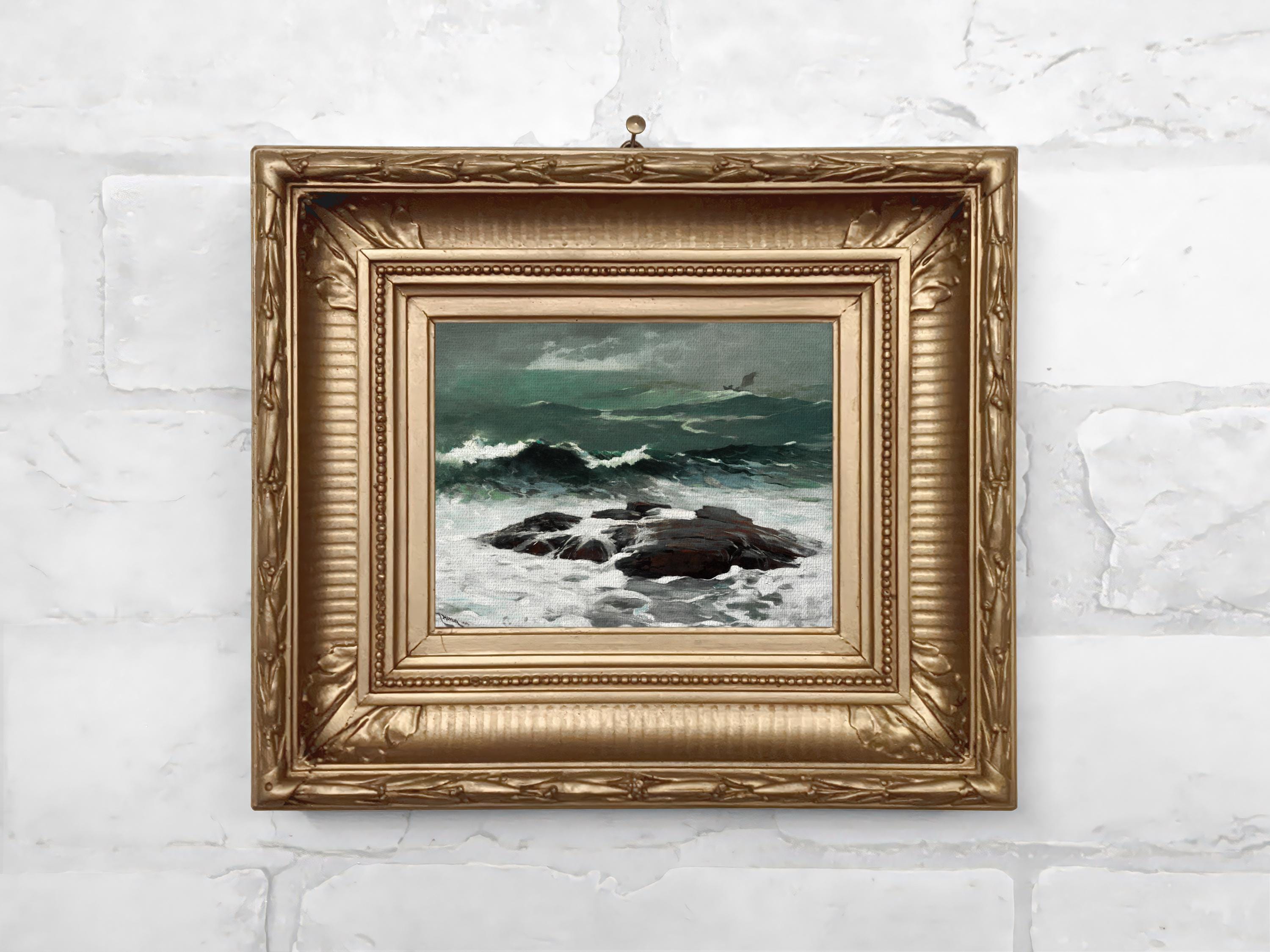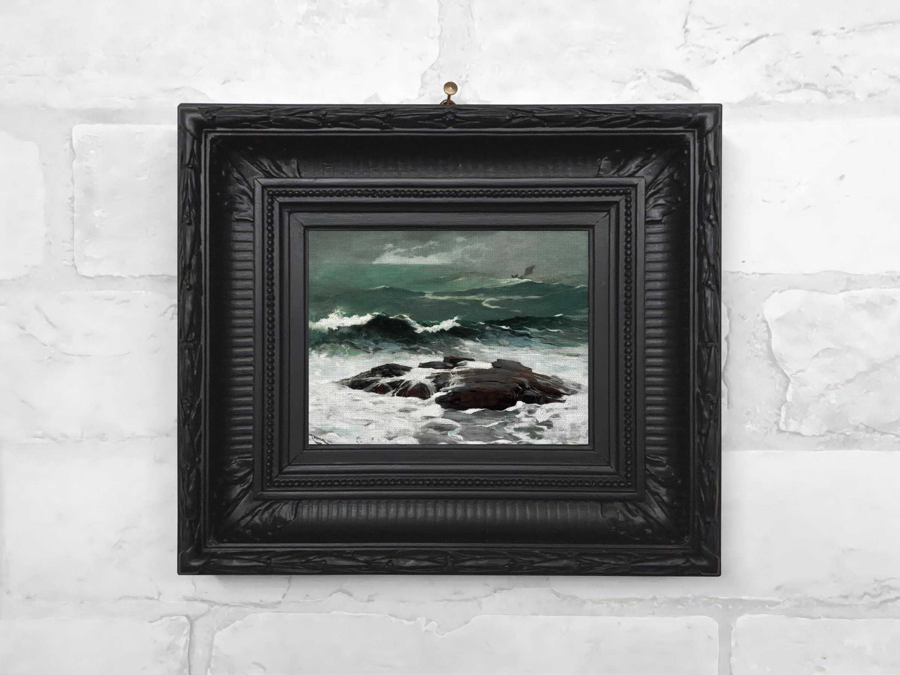 A miniature framed seascape print on canvas, depicting a moody ocean storm under a heavy summer sky. Perfect for coastal or nautical interiors and vintage maritime decor.
