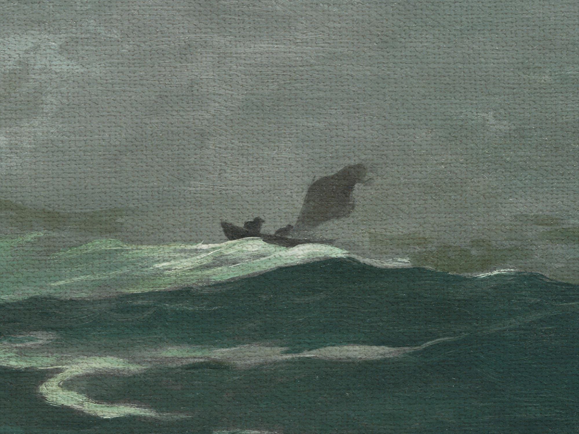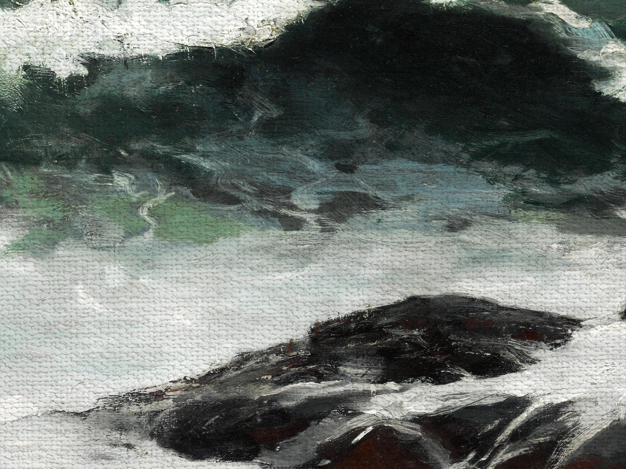 Winslow Homer produced hundreds of paintings, watercolors, and prints. His career spanned over five decades, from Civil War illustrations in the 1860s to late seascapes in the early 1900s. This painting belongs to his late period, when he was living in Prouts Neck, Maine, and obsessively painting the sea in all its moods.