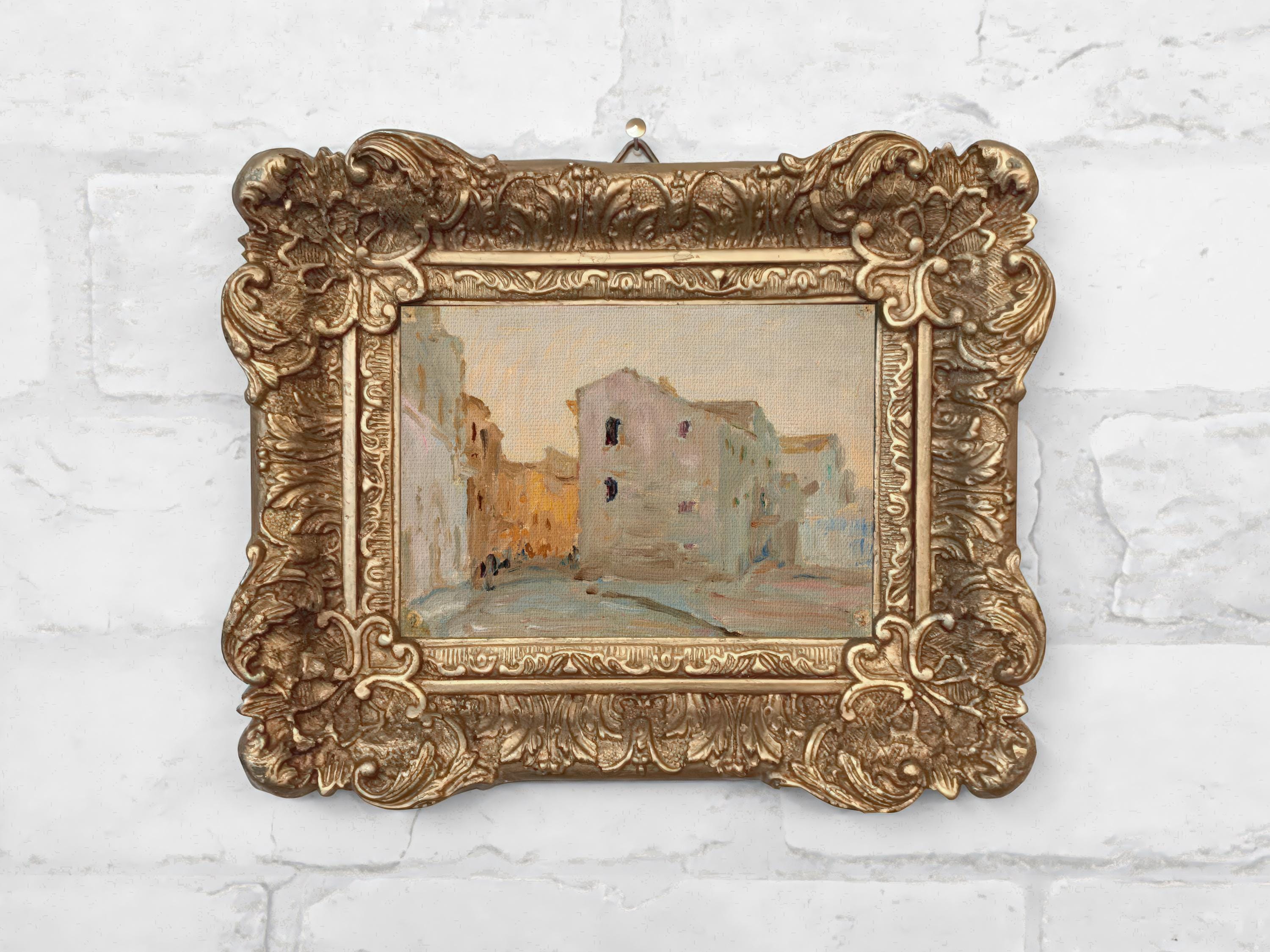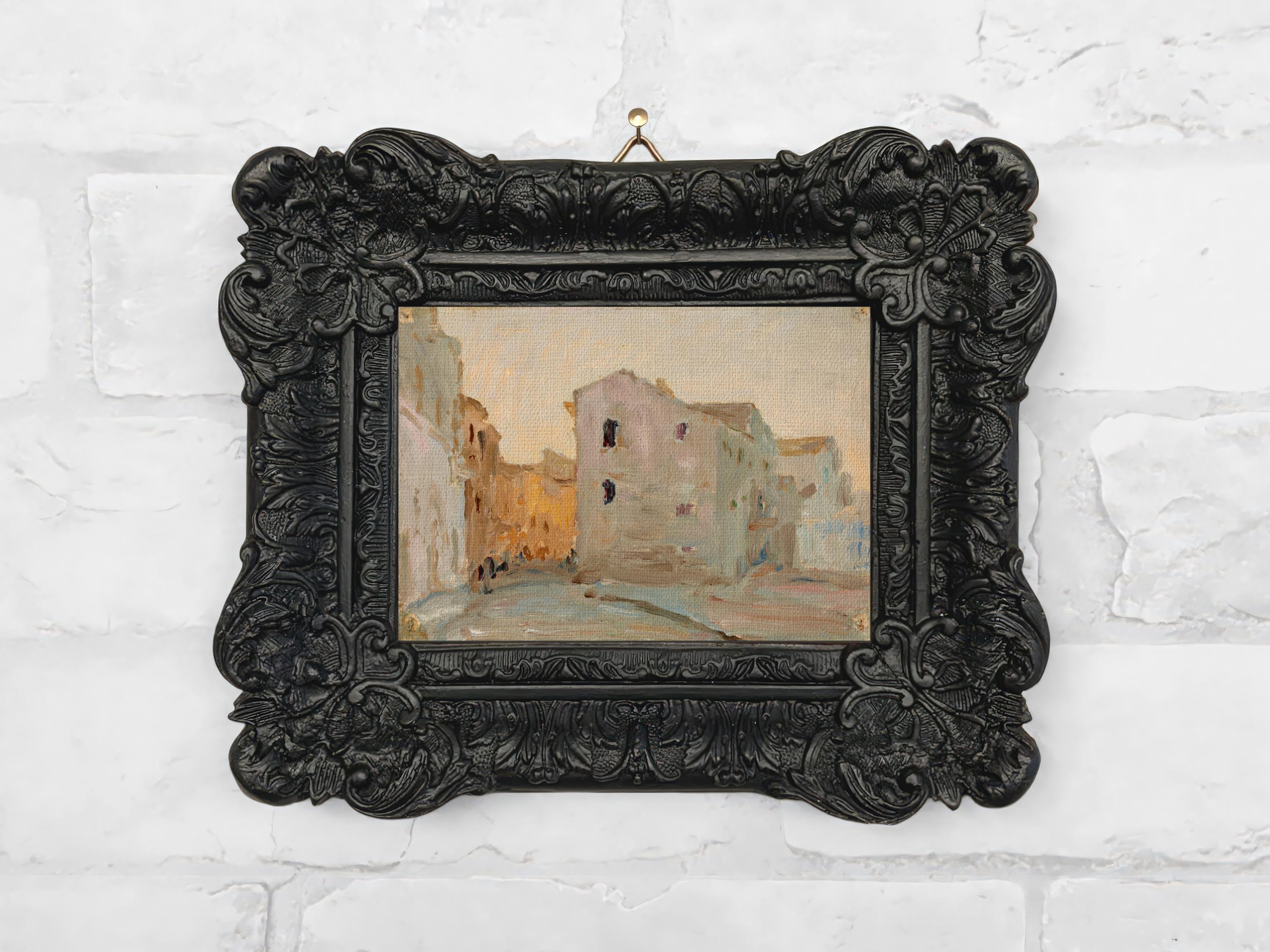 Miniature framed cityscape art print on canvas, vintage-style reproduction of an early 20th-century Italian architectural painting. Ideal for European decor, old world interiors, and lovers of classical city views with timeless atmosphere.