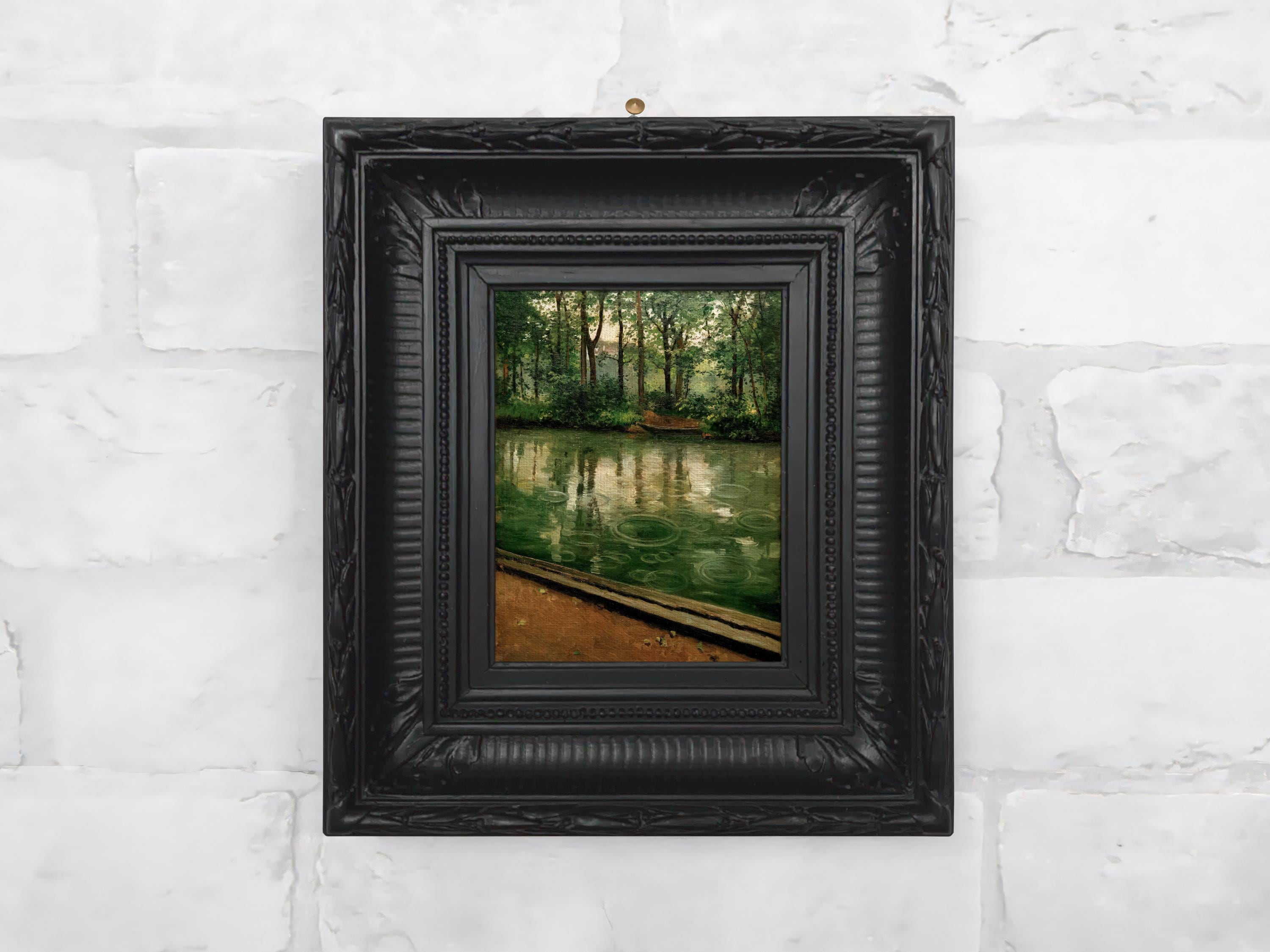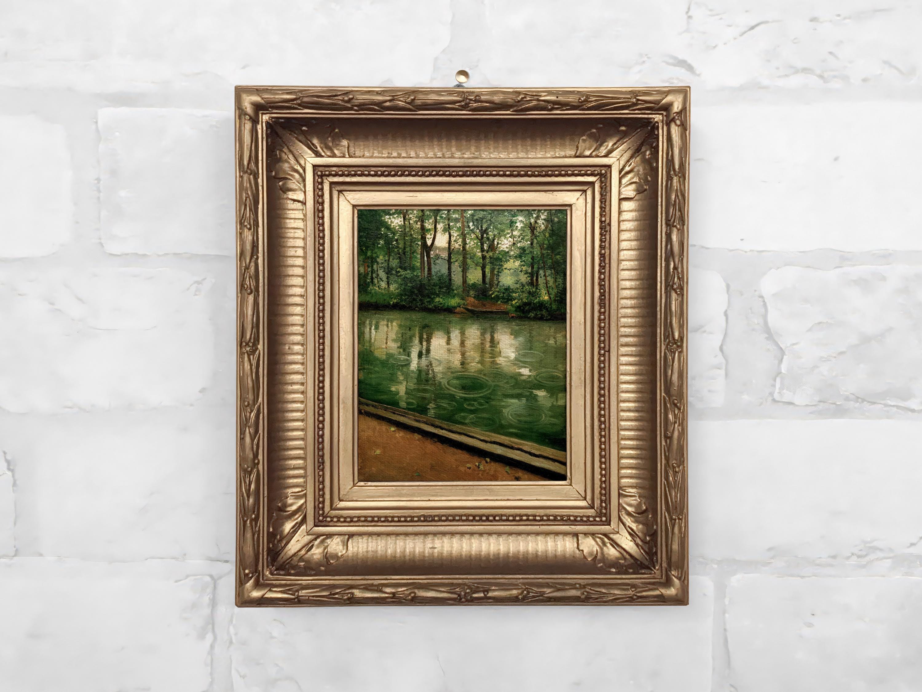 Miniature framed vintage landscape canvas print featuring a quiet river scene with soft rain and muted light. Perfect for cottagecore or nature inspired gallery walls.