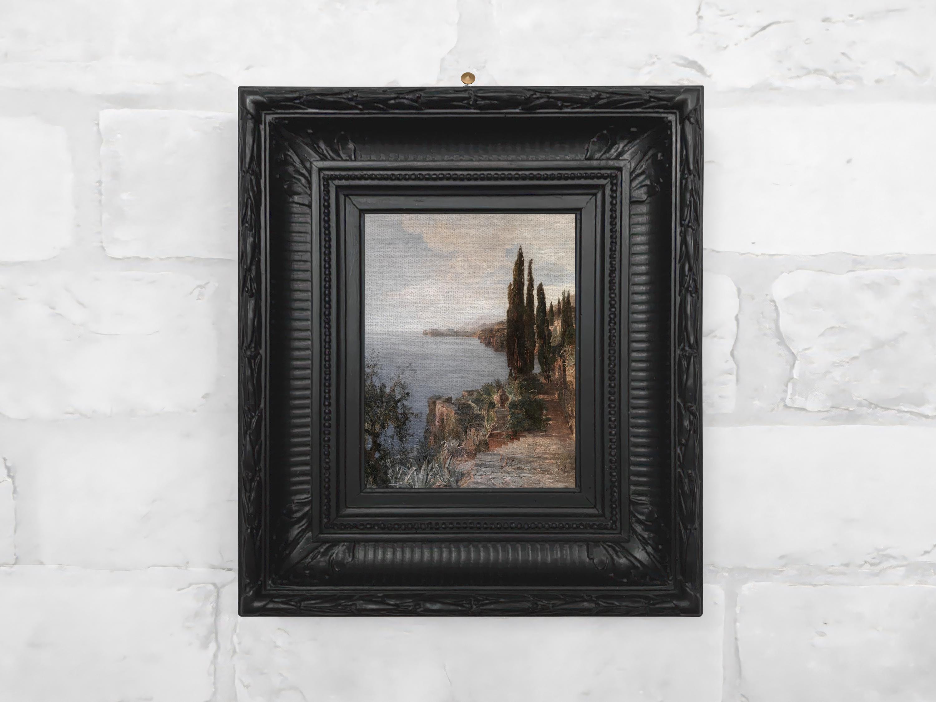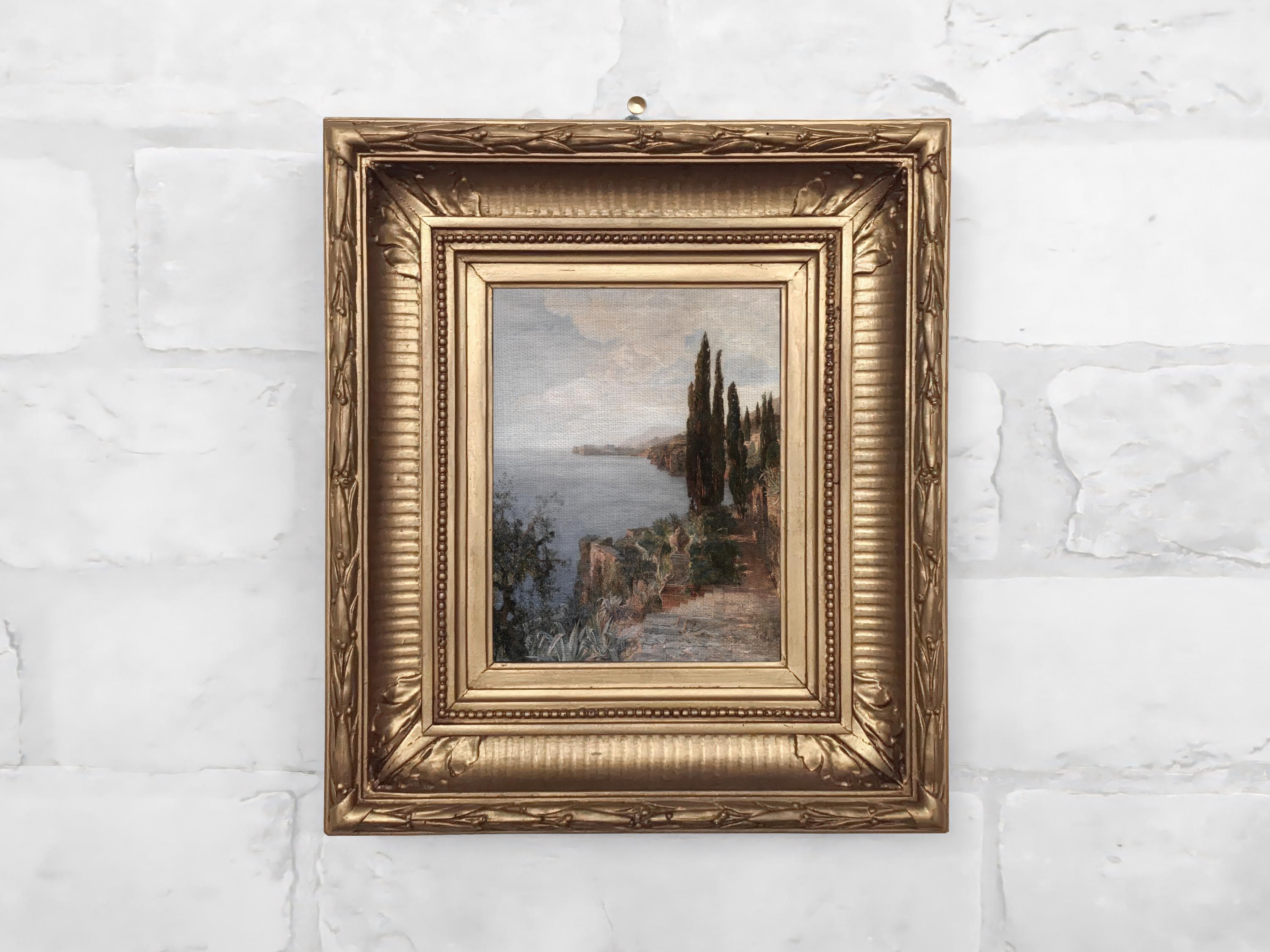 This mini oil painting reproduction is printed on archival canvas and paired with a handcrafted frame cast in Hydrostone plaster, using a mold from a 19th-century antique. Finished in-studio to capture the texture and patina of a real vintage frame, it offers all the beauty of an heirloom – without having to inherit it. Available in aged gold or classic black, depending on your mood (or your wall).