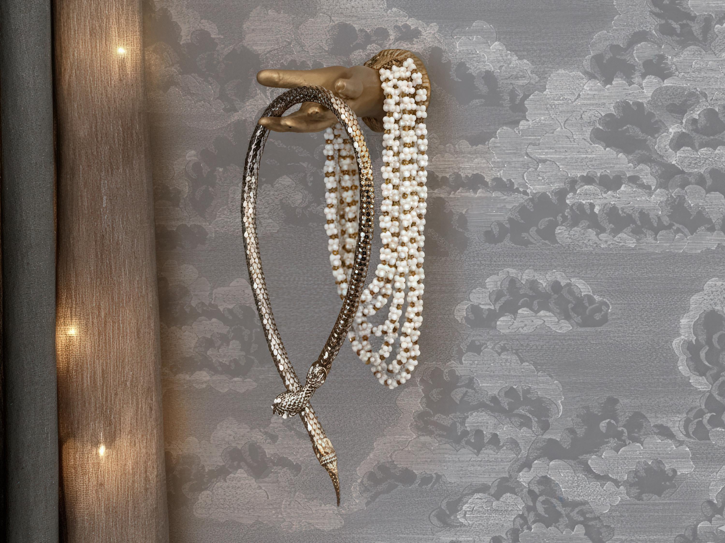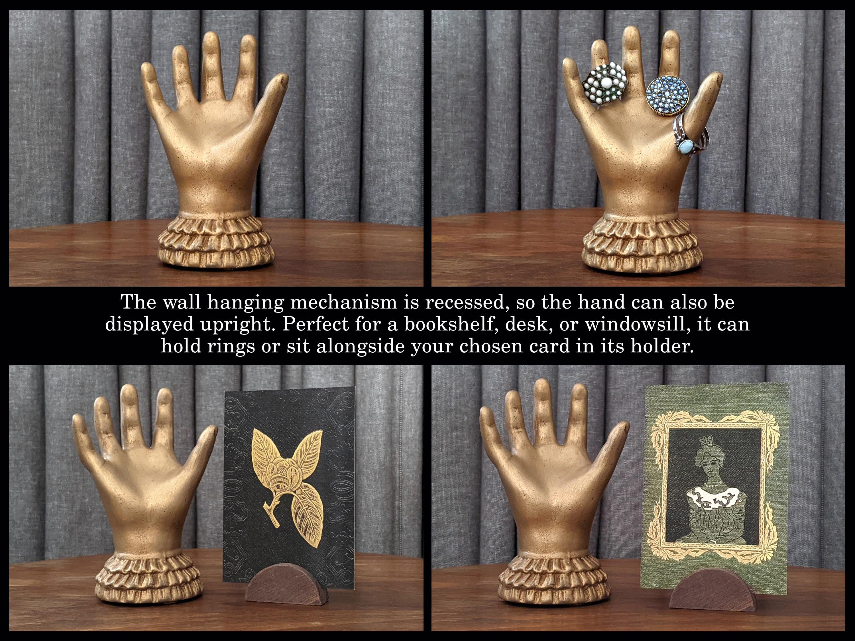 The hand serves as a striking little wall accent. Graphic, slightly mysterious, and easy to place, it adds instant personality whether mounted beside books, tucked into a gallery wall, or hung where it can quietly catch the eye. Once it’s on the wall, you can rotate the hand to any direction you like. It can hold rings or necklaces, but mostly it just makes a home feel more interesting and unmistakably yours. It’s designed to hang using the included recessed wall-mount system, but can also sit on a table with the included cork pads if you decide to move it later.