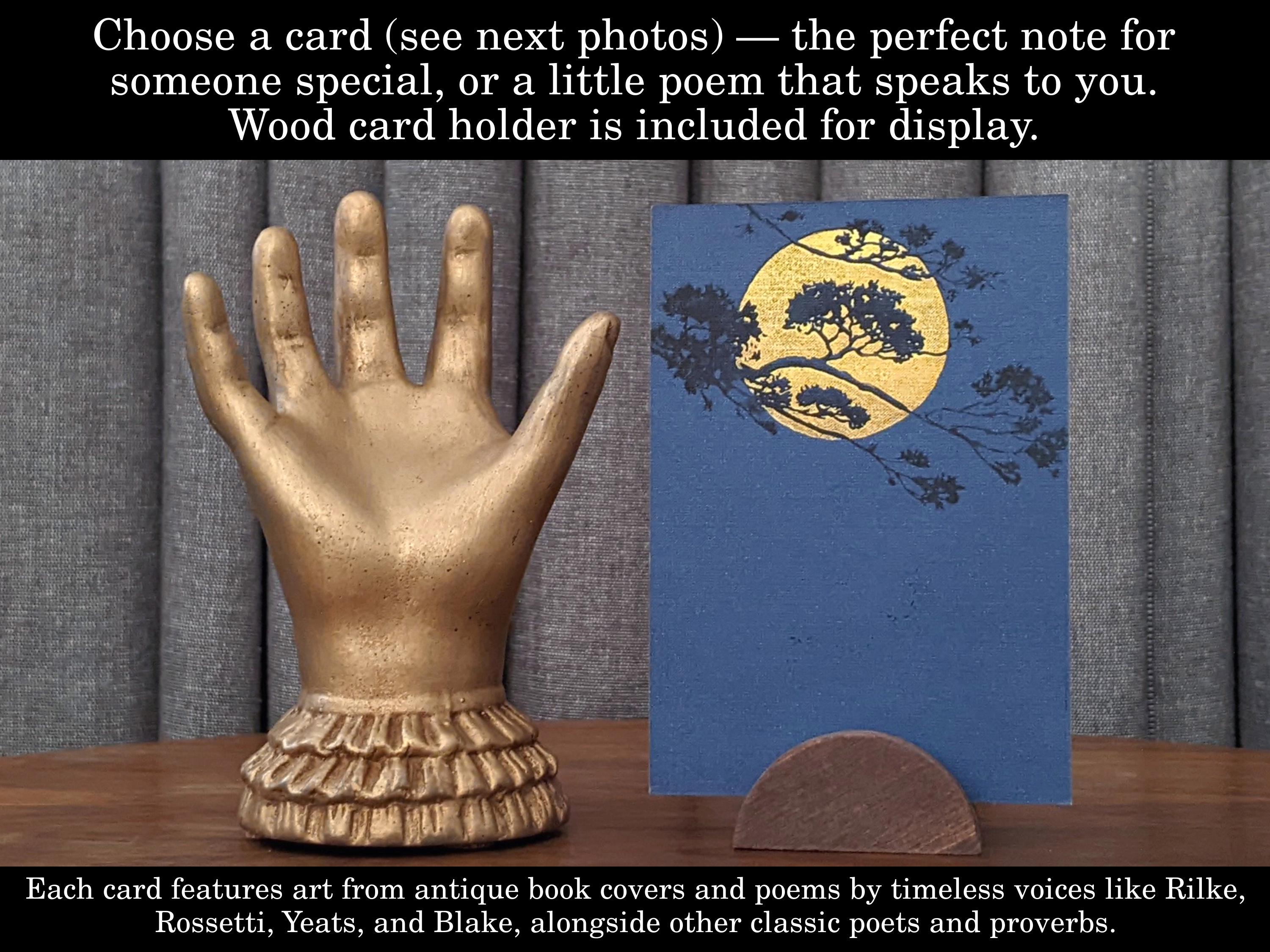 Each hand comes with the card you choose, along with a small wooden holder to display it. Given as a gift, it becomes a quiet symbol of connection and a reminder that someone is thought of, remembered, and cared for. Each card features art from antique book covers and poems by timeless voices like Rilke, Rossetti, Yeats, and Blake, alongside other classic poets and proverbs. You can also choose the full 12-card library as an optional upgrade.
