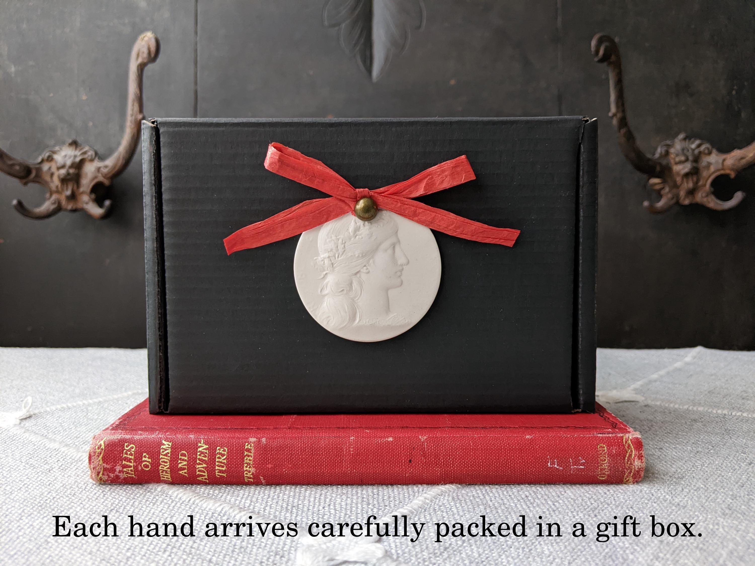 An antique reproduction of a small Victorian hand, designed to hang beautifully on the wall and hold a ring or a necklace. Paired with a poem of your choice on a card featuring an antique book cover. Perfect for adding charm to a gallery wall, reading nook, or beside a bookshelf, it’s an ideal gift for anyone who appreciates unusual, story-filled décor.