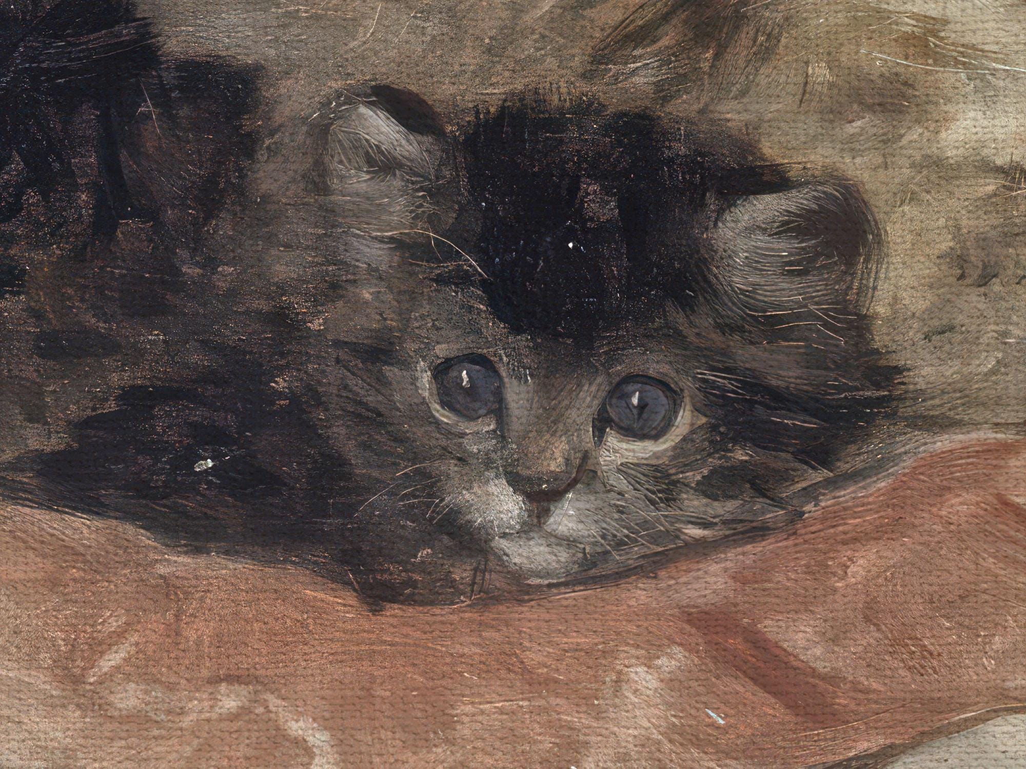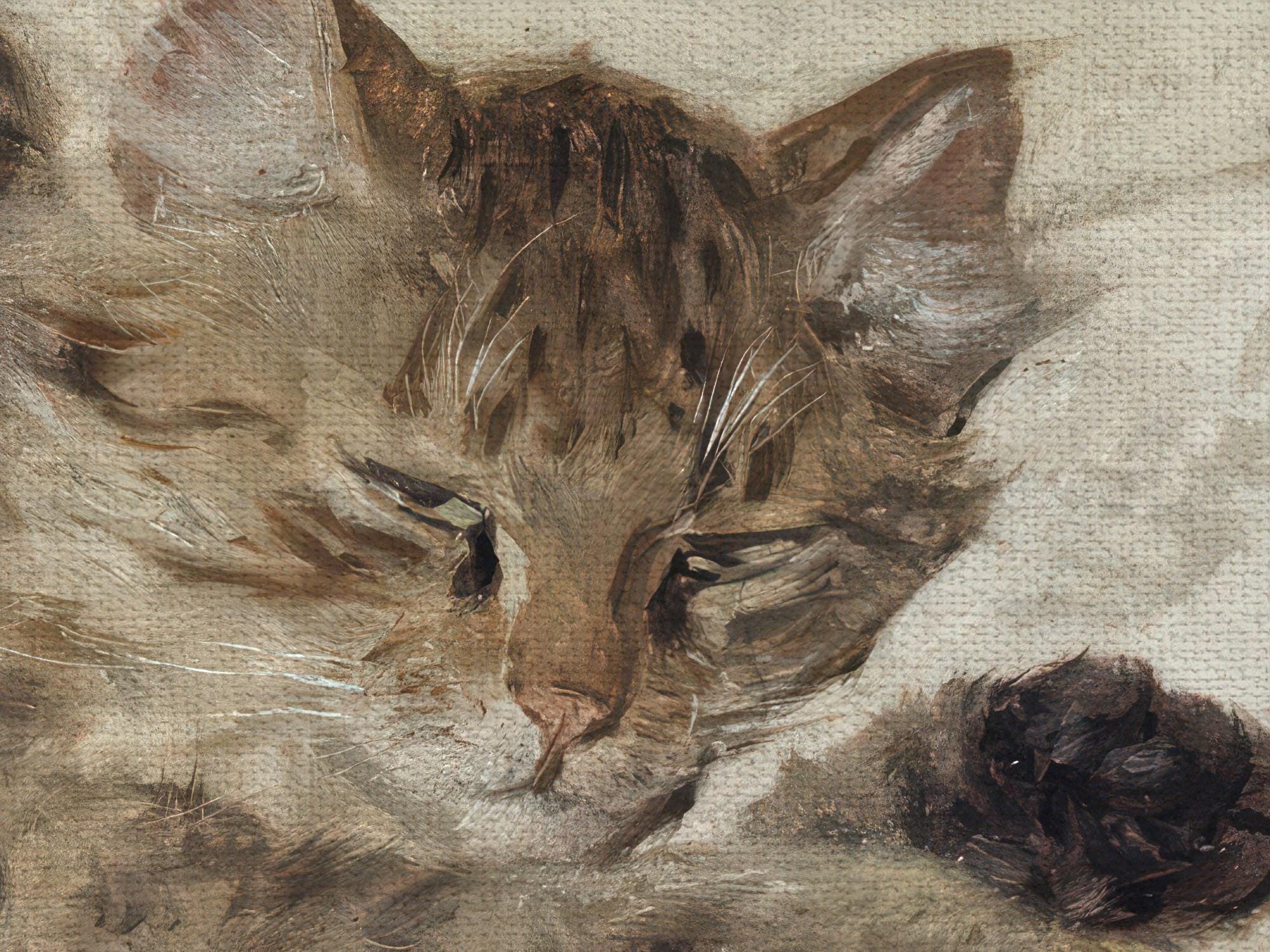 Before Ronner-Knip, animal painting was dominated by horses, dogs, and livestock. Cats weren’t considered particularly noble subjects. She changed that. In the mid-1800s she started painting cats in cozy domestic scenes – kittens tangled in yarn, lounging on velvet chairs, climbing over furniture. Victorians absolutely loved it. Her work helped turn cats into fashionable household companions rather than just mousers. In this piece a tired mother cat rests with her sleepy kittens, the peaceful aftermath of a very busy day.