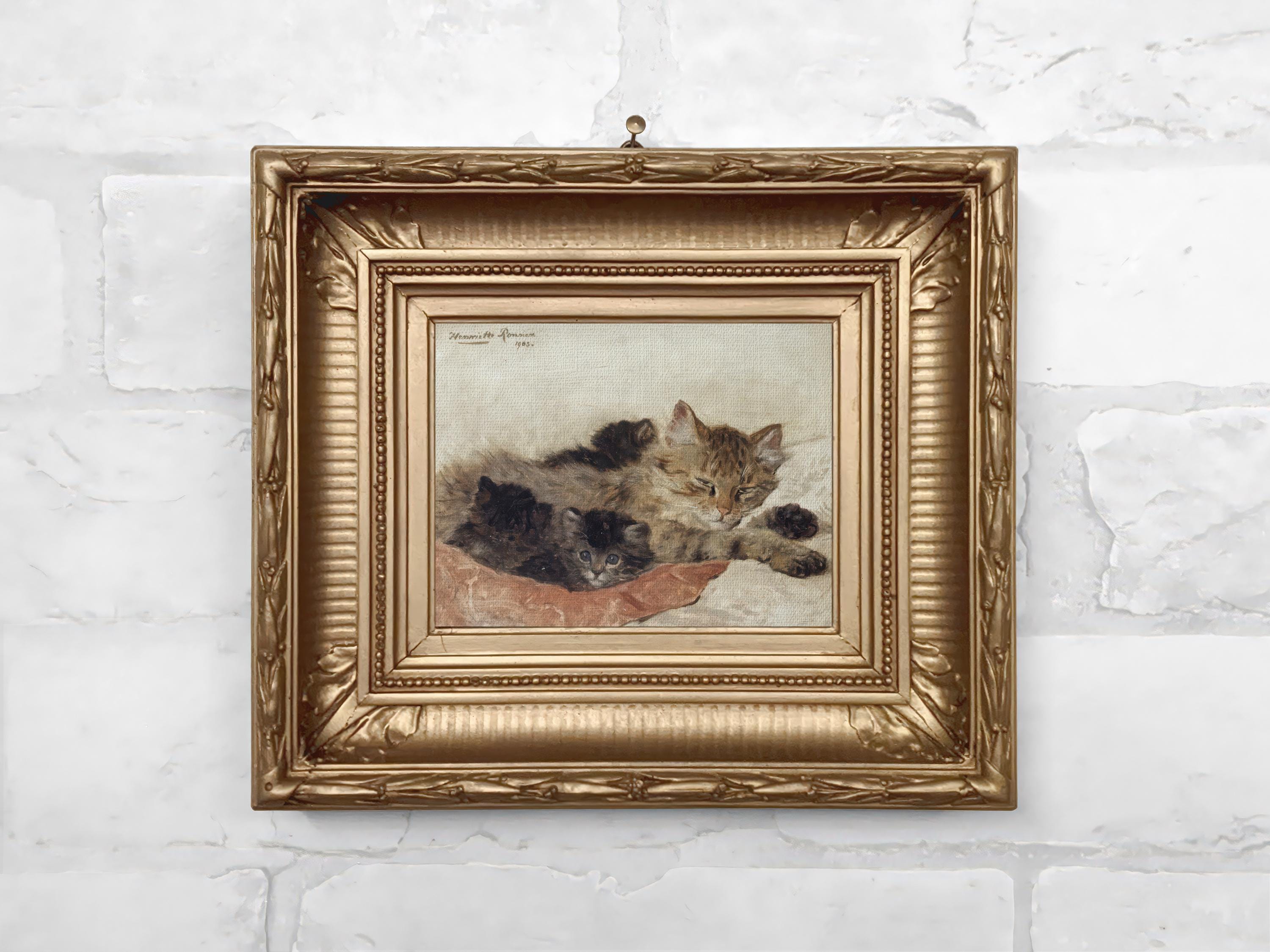 Small framed cat themed art print on canvas, vintage-style reproduction of an antique painting. Ideal for cozy home decor, vintage gallery walls, and soft-toned home styling.