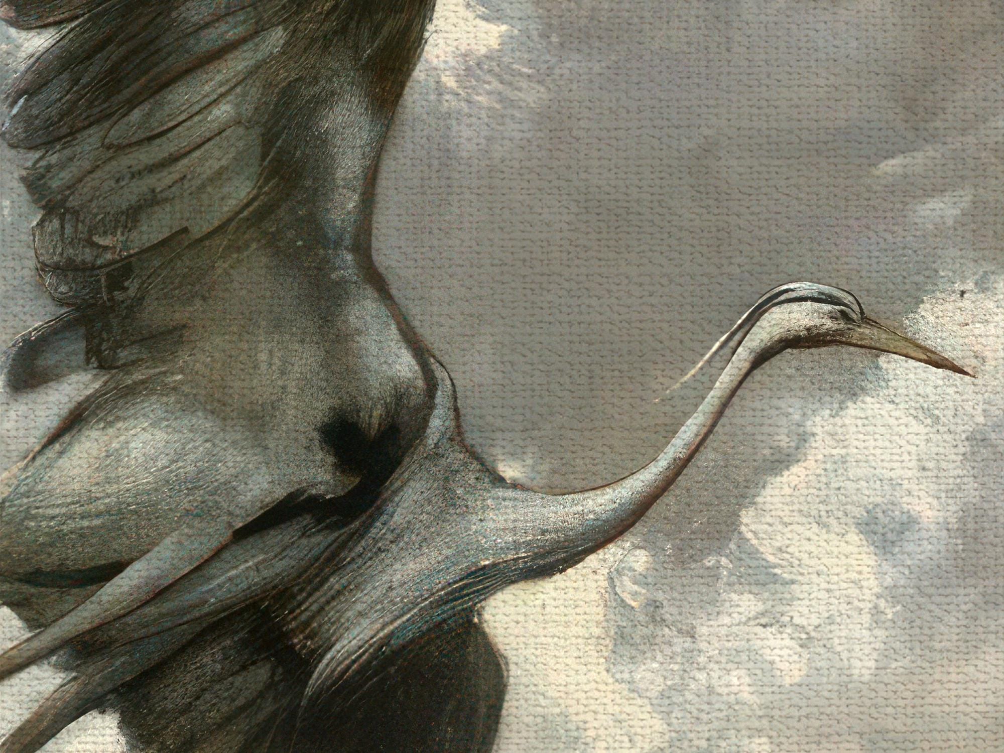 This painting features a flock of strange, elegant birds gliding through big rolling clouds while the landscape sits far below them.