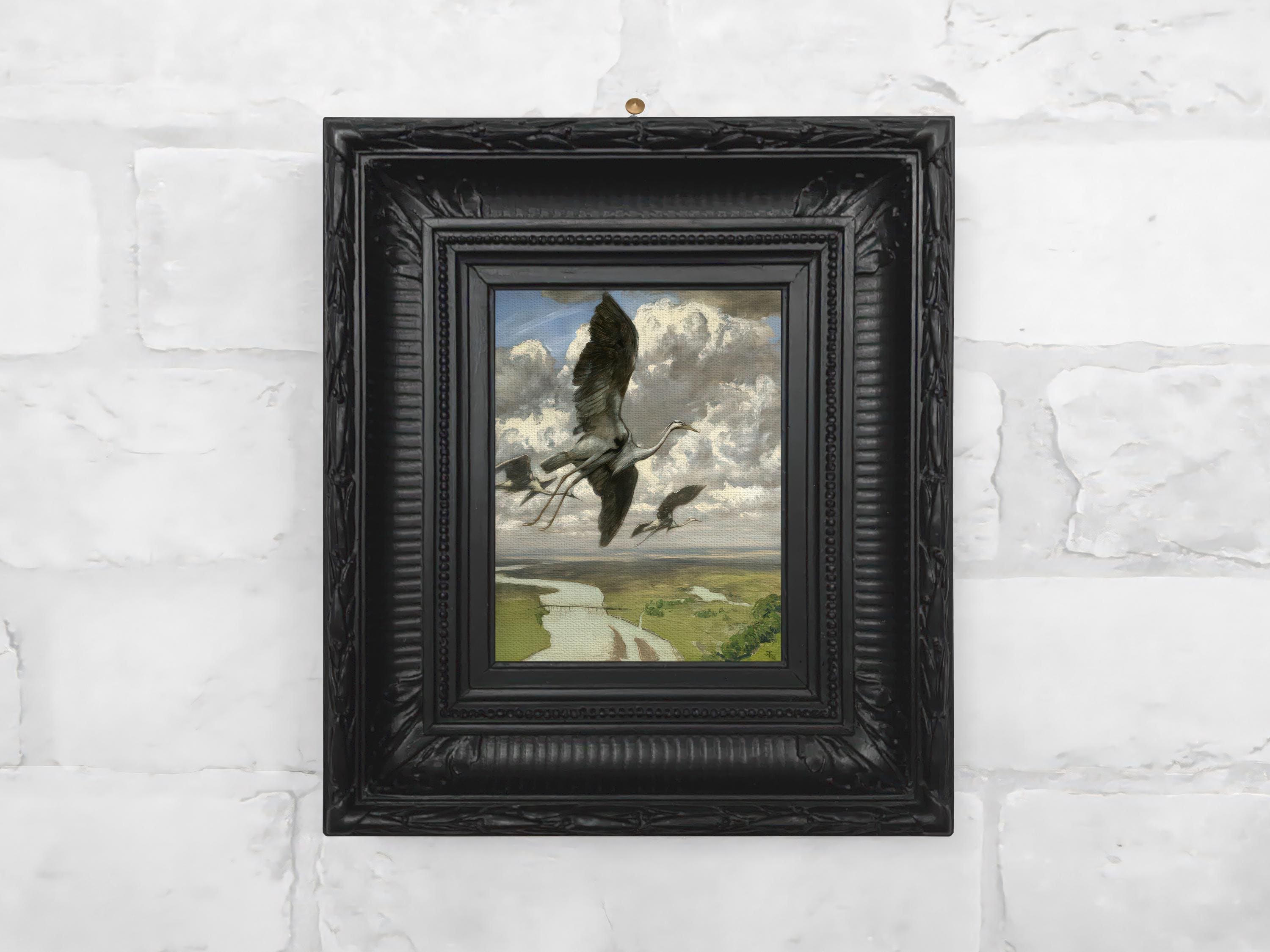 Small framed art print on canvas, vintage-style landscape wall art with mythical flying birds. A versatile piece for dark academia interiors and storybook wall galleries.