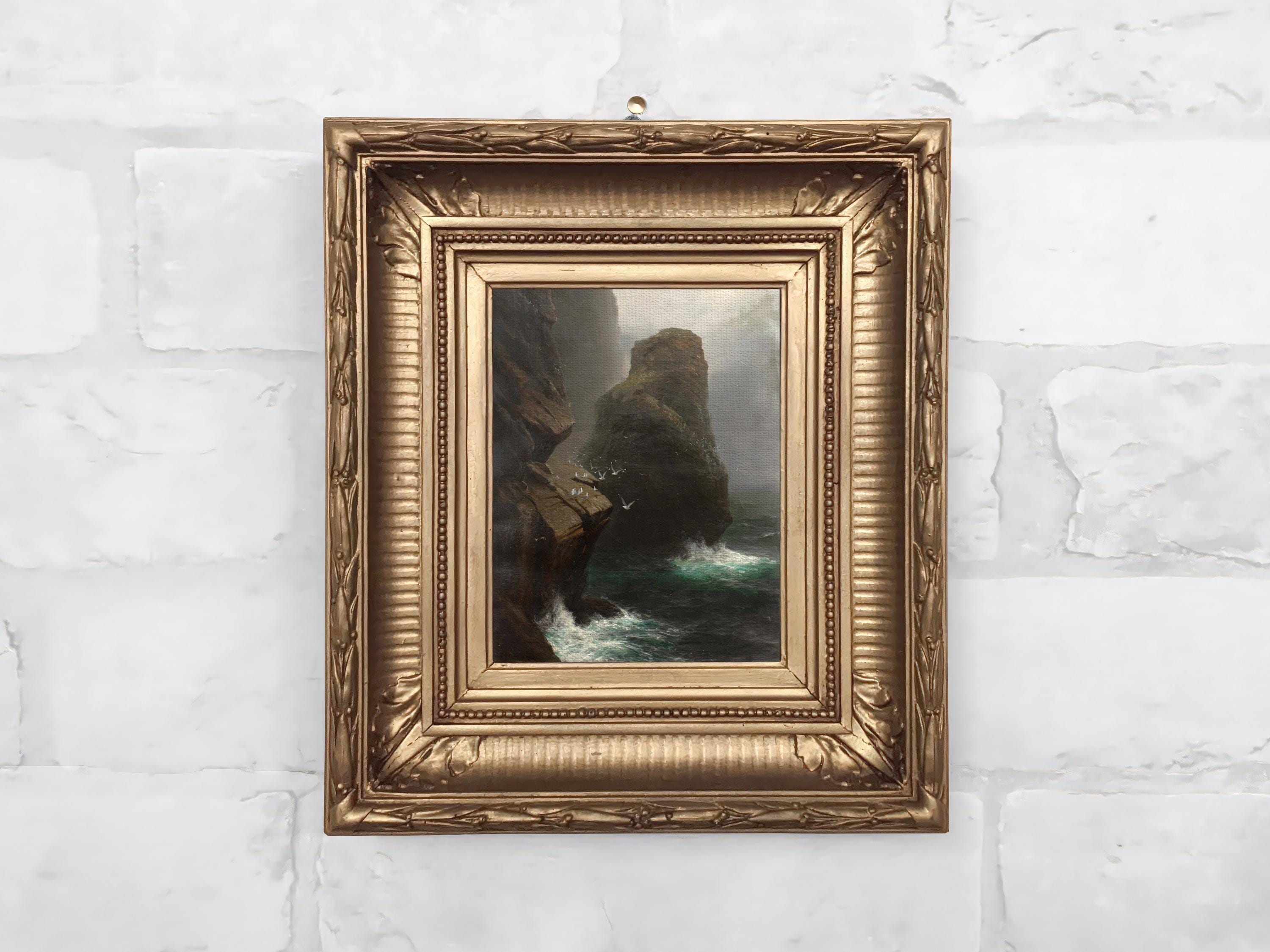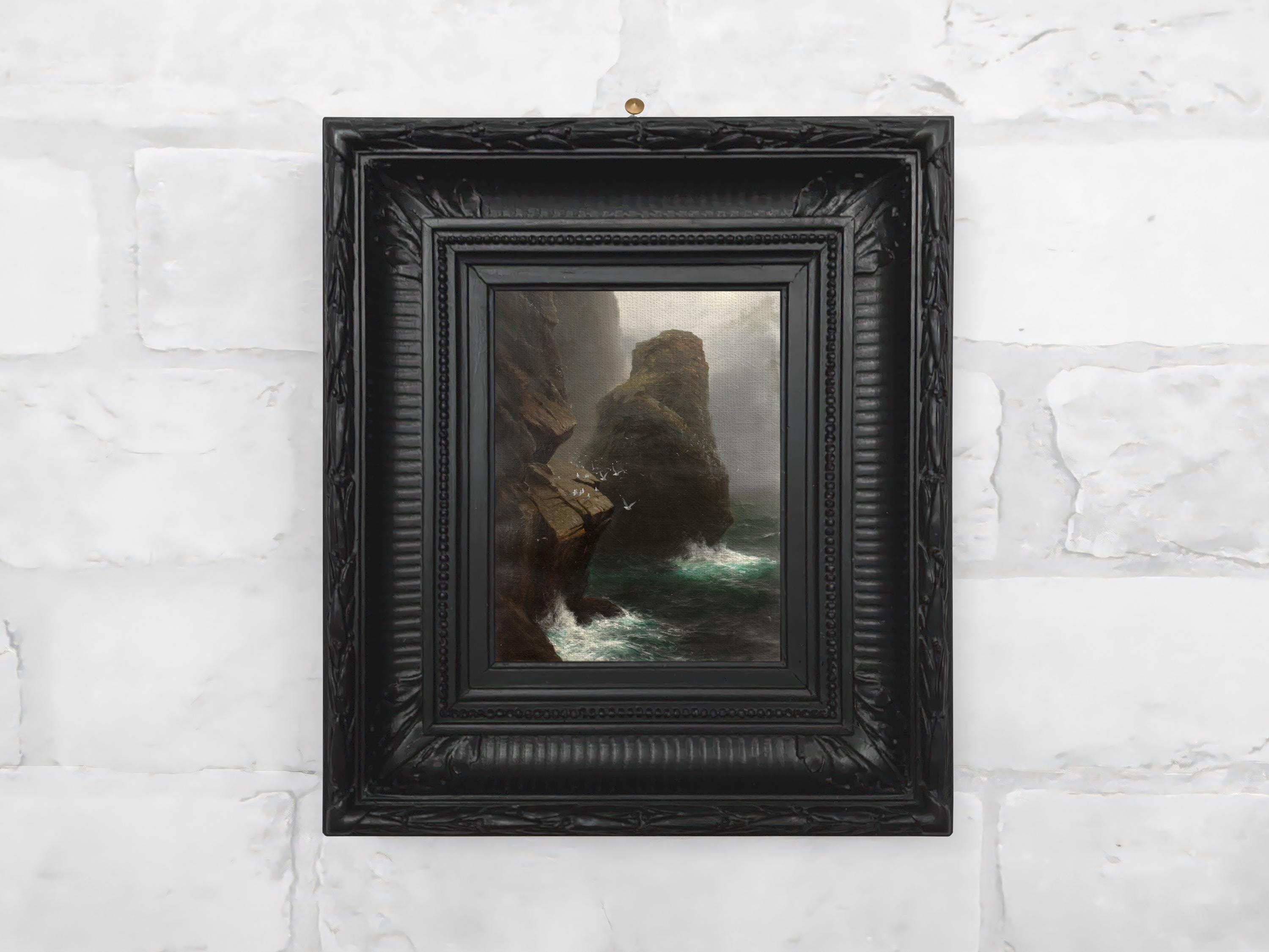Miniature framed vintage coastal canvas print featuring a stormy rocky shoreline with crashing waves, drifting fog, and moody light. A strong fit for coastal, nautical, or atmospheric gallery wall collections.